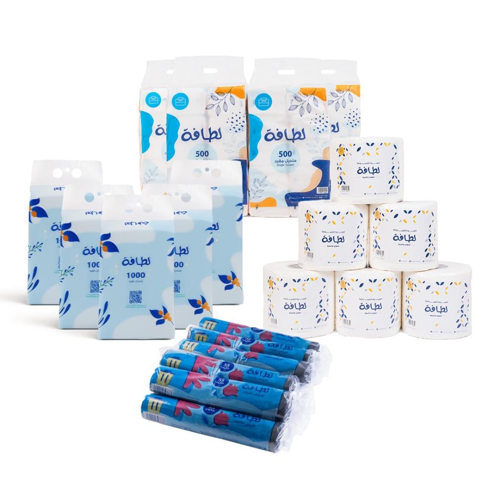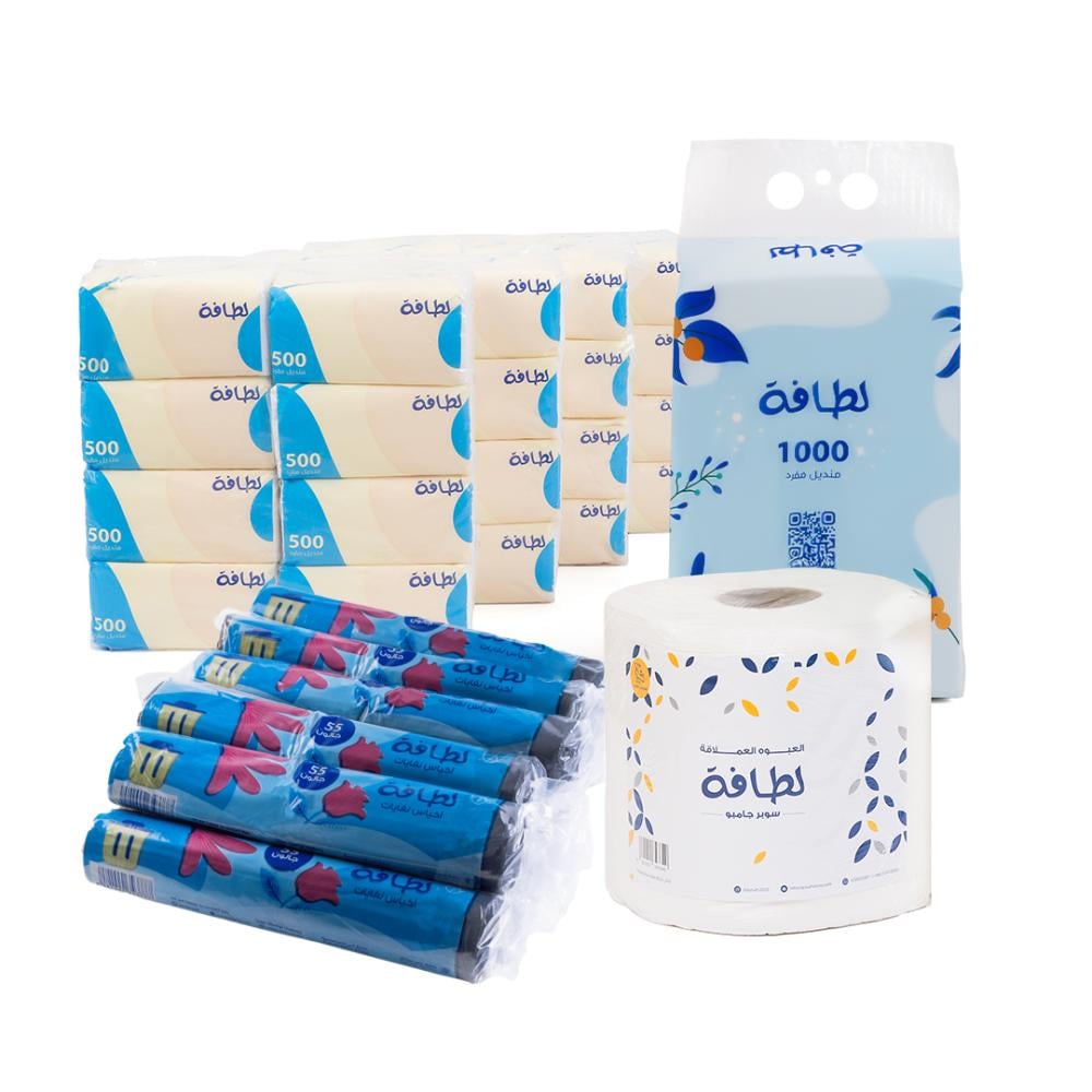 كل ما يحتاجه منزلك في بكج واحد!بكج لطافة المتكامل صُمم خصيصًا لتوفير الراحة والنظافة بأعلى جودة وبأفضل سعر.كرتون مناديل وجه 500 مفرد – نعومة وعنا...